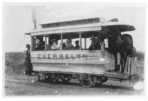 No neg number: "Cherrelyn" (type) trolly, Denver CO, circa 1900, exposure ok. Horse pulls trolly up hill and coasts down hill.