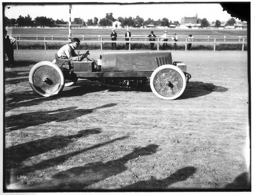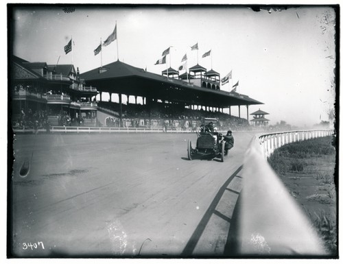neg number 7016, under exposed: Barney Oldfield racing Henry Ford's #999 about 1903