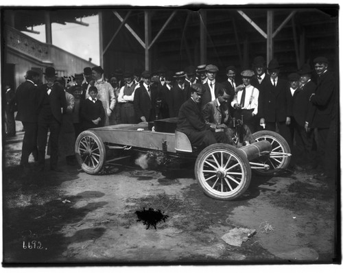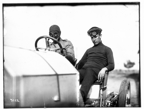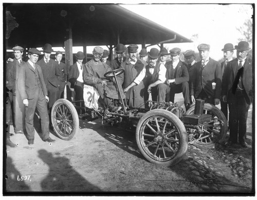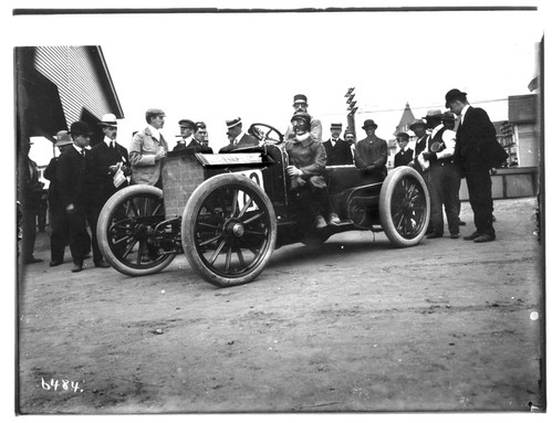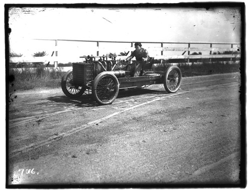 neg number 8286. From Brian Waite: is a Frayer-Miller race car that was one of three that raced in the 1906 Vanderbilt Cup. Interestingly, the driver of the car I am reconstructing, Ben Lawwell, had an older brother Frank Lawwell who was one of the three drivers for Frayer. The other drivers were Frayer himself and a guy named Belden. I believe this photo shows Frayer himself. I have other articles and photos of these cars from the period. Another interesting point is that Eddie Rickenbacker was a part of this group of racers well before his time in WW1 and later fame. He worked as a kid with this group and Oscar Lear, Frayer, Lawwell and others.