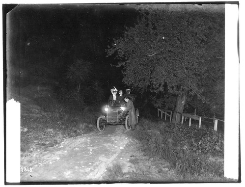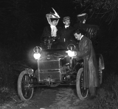 neg number 8365: night travels. Man looking at map and three passengers looking toward tree. When blown-up they look a bit startled, exposure ok.